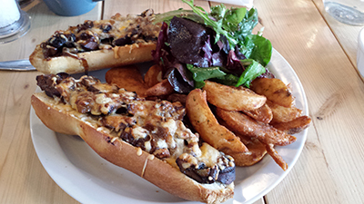 Opted for the cremini and portobello mushrooms sautéed with caramelized onion and deglazed with red wine, served open-faced on a fresh baked roll with melted Welsh Cheddar.